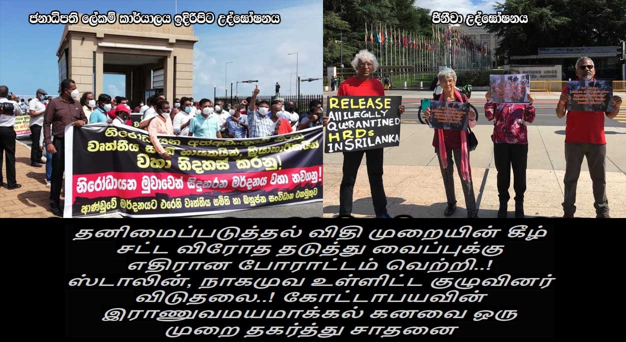 பலாத்கார தனிமைப்படுத்தலுக்கு உட்படுத்தப்பட்ட ஆர்ப்பாட்டக்காரர்கள் முதலில் விமானப் படை முகாமுக்குள் இருந்து ஆர்ப்பாட்டத்தை முன்னெடுத்தனர். ஸ்டாலின், தென்தே தேரர் உள்ளிட்ட குழுவினர் தடுப்புக் காவல் உத்தரவு எதுவும் இன்றி தடுத்து வைக்கப்பட்டிருந்தனர். இதற்கு எதிர்ப்பு தெரிவிக்கும் முகமாக கொழும்பு லிப்டன் சுற்று வட்டத்தில் ஒரு நாள் விட்டு ஒரு நாள் என மூன்று ஆர்ப்பாட்டங்கள் முன்னெடுக்கப்பட்டன. நேற்று அதன் இறுதி ஆர்ப்பாட்டம் நடைபெற்றது. இந்த எதிர்ப்பு ஆர்ப்பாட்டங்களில் அதிகளவான தொழிற்சங்க தலைவர்கள், சிவில் அமைப்பின் பிரதிநிதிகள், பொது மக்கள் என பல தரப்பினரை காண முடிந்தது. ஆர்ப்பாட்டம் செய்ததாக கைது செய்த அரசாங்கம் இந்த ஆர்ப்பாட்டத்தில் ஈடுபட்டவர்களை கைது செய்ய நடவடிக்கை எடுக்கவில்லை என்பதுடன் அரசாங்கம் ஒரு படி பின்வாங்கி இருந்தது. எனினும் நேற்றைய ஆர்ப்பாட்டம் ஜனாதிபதி செயலகம் வரை பேரணியாக சென்ற போதும் அதனை தடுத்து நிறுத்த அரசாங்க தரப்பில் எவ்வித நடவடிக்கைகளும் முன்னெடுக்கப்படவில்லை. (அதன் புகைப்படங்கள் இணைக்கப்பட்டுள்ளன.)