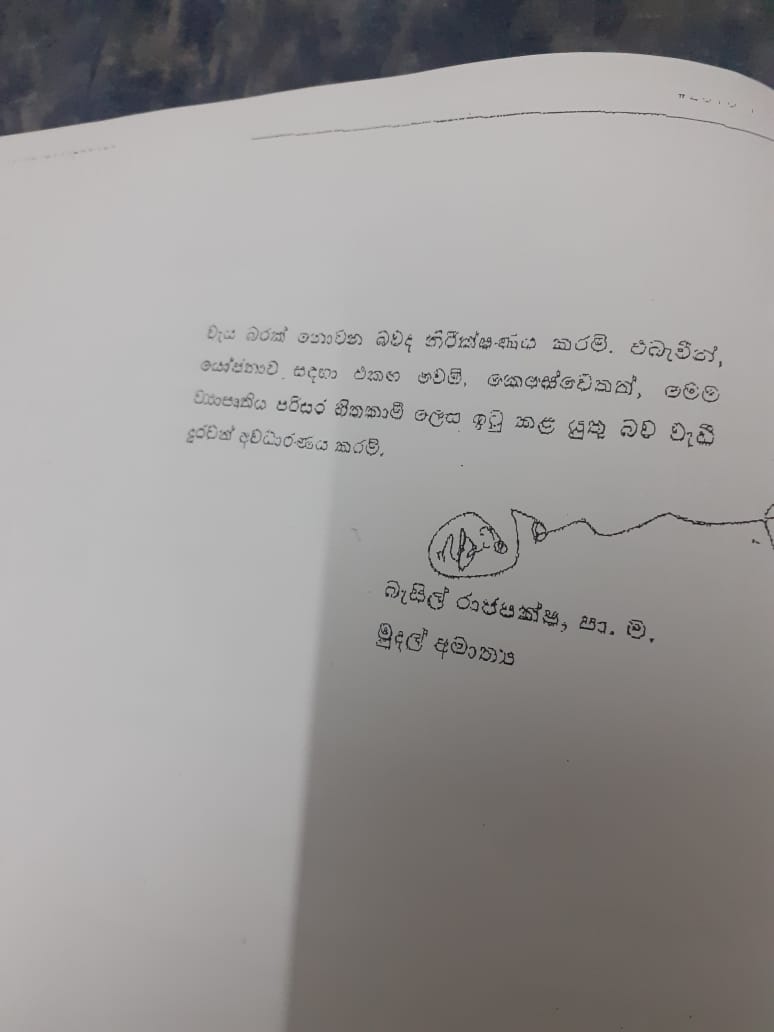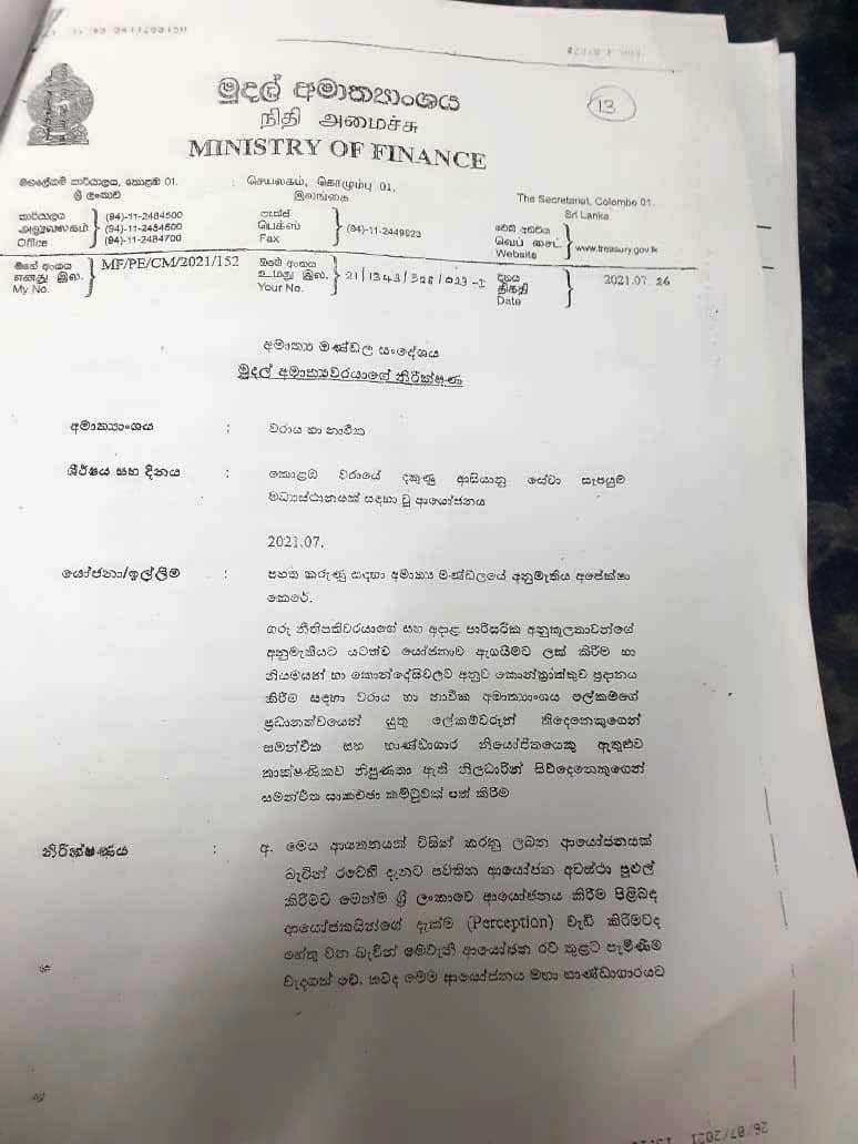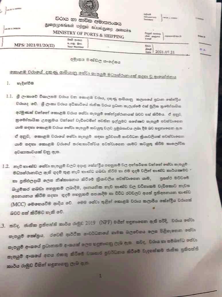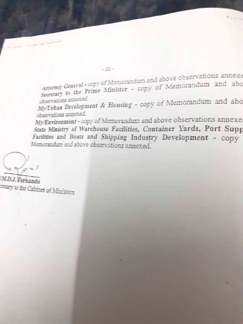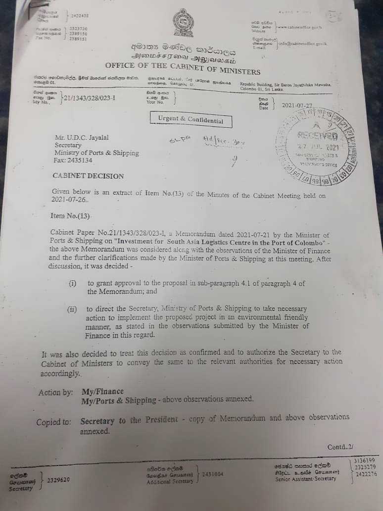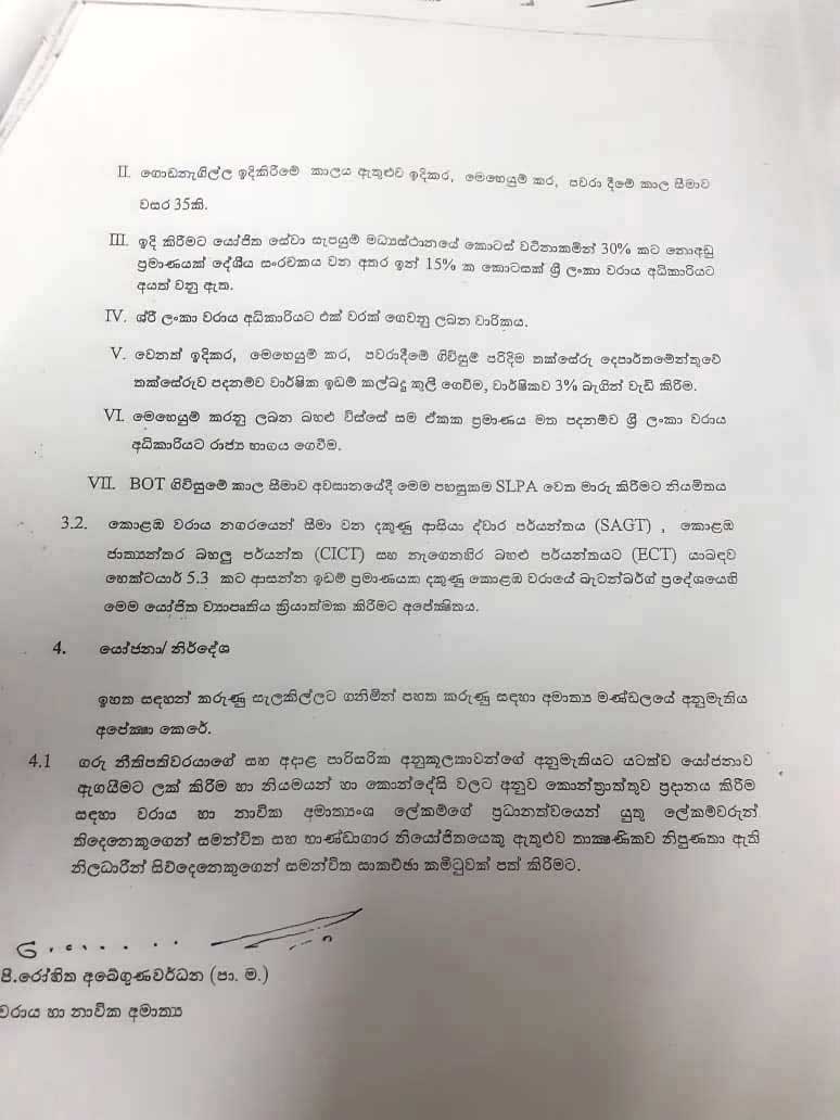 துறைமுக அபிவிருத்தி அமைச்சர் ' ரத்தரங்க' என்ற ரோஹித்த அபேகுணவர்த்தன கடந்த ஜூலை 21 ம் திகதி இது தொடர்பான அமைச்சரவை பத்திரத்தை அமைச்சரவைக்கு தாக்கல் செய்துள்ளார். இந்த மோசடி திட்டத்திற்கு ராஜபக்ஷ குடும்ப அரசாங்கம் விரைந்து செயற்பட்டு 'ஏழு அறிவு ' கொண்ட நிதி அமைச்சர் ஜுலை 26 ம் திகதியே இந்த பத்திரத்திற்கு அனுமதி அளித்துள்ளார். அதன் பின் 27 ம் திகதி அமைச்சரவையில் சமர்பிக்கப்பட்டு அன்றே அனுமதியும் கிடைத்துள்ளது. ( அதனுடன் தொடர்புடைய அமைச்சரவை பத்திரம், நிதி அமைச்சரின் அனுமதி மற்றும் அமைச்சரவையில் வழங்கப்பட்ட அனுமதி குறித்த ஆவணங்கள் இங்கு இணைக்கப்பட்டுள்ளது. )
