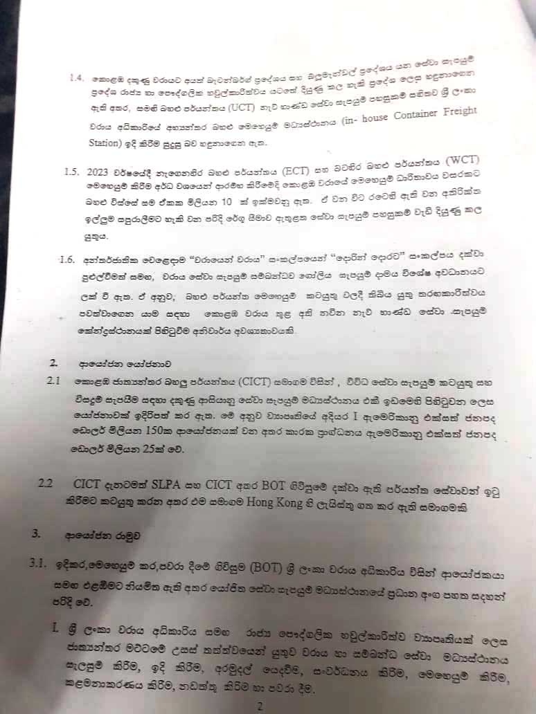 3. பேச்சுவார்த்தை குழுவில் துறைசார் நிபுணத்துவம் அடங்கிய நான்கு அதிகாரிகள் இருக்க வேண்டும் என அமைச்சரவை பத்திரத்தில் குறிப்பிடப்பட்டுள்ள போதும் அந்தக் குழுவில் நியமிக்கப்பட்டுள்ள துறைமுக உப தலைவர் பிரசாந்த ஜயமான்ன மற்றும் மேலதிக நிர்வாக பணிப்பாளர் ஆகியோர் லொஜிஸ்டக் குறித்து ஒரு துளி அறிவும் இல்லாத நபர்களாவர். லொஜிஸ்டிக் பிரிவிற்கு நியமிக்கப்பட்ட அதிகாரி கனிஸ்ட பிரிவு அதிகாரி ஆவார். பிரசாந்த ஜயமான்ன என்பவர் நாமல் ராஜபக்ஷவின் கருப்பு பணத்தை வௌ்ளை பணமாக மாற்றும் நபர் ஆவார். லொஜிஸ்டிக் குறித்து நிபுணத்துவம் பெற்ற துறைமுகத்தில் உள்ள அதிகாரிகள் இத்திட்டத்தில் இருந்து ஒதுக்கி வைக்கப்பட்டுள்ளதுடன் அனைத்து திட்டங்களும் பாஸ்ட் என் போர்வாட் என்ற அடிப்படையில் முன்னெடுக்கப்பட்டுள்ளது.