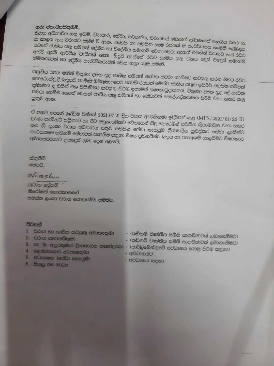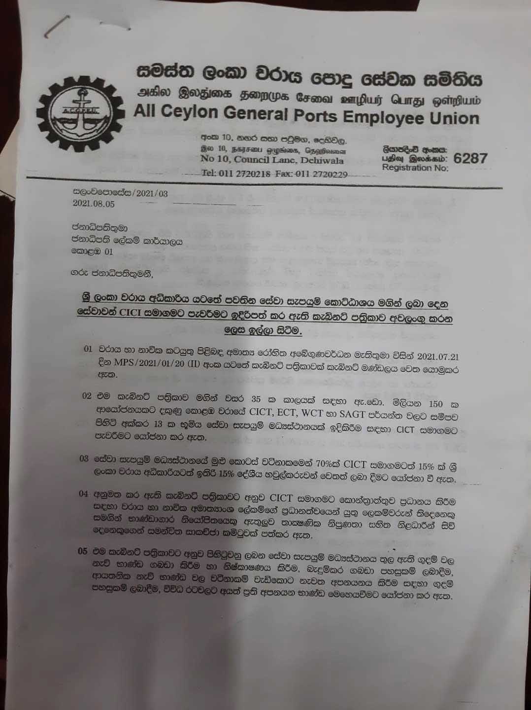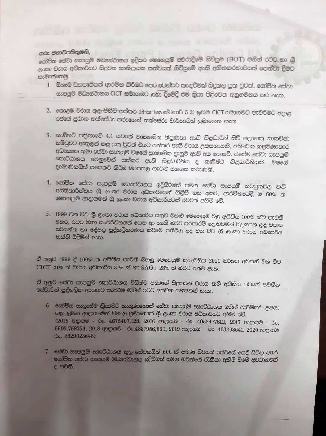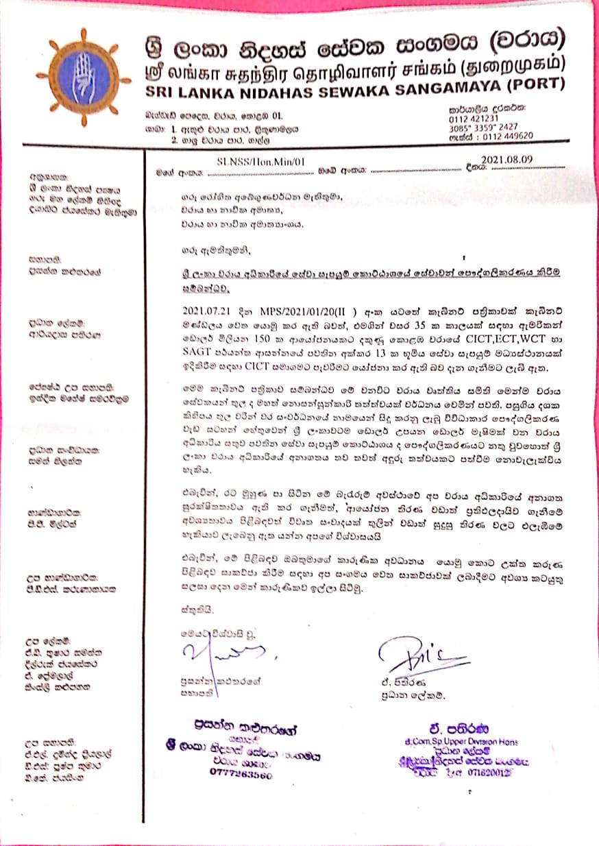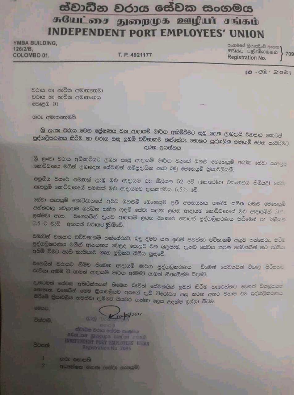இந்த திட்டத்திற்கு எதிர்ப்பு தெரிவித்து கொழும்பு துறைமுகத்தின் பிரதான தொழிற்சங்கமான அகில இலங்கை துறைமுக பொது சேவை சங்கம், ஶ்ரீலங்கா சுதந்திர சேவை சங்கம் ( துறைமுகம் ), சுயாதீன துறைமுக சேவை சங்கம் ஆகியவை ஜனாதிபதி கோட்டாபய ராஜபக்ஷ மற்றும் துறைமுக அபிவிருத்தி அமைச்சருக்கு அனுப்பி வைத்துள்ள கடிதம் இங்கே தரப்பட்டுள்ளது.