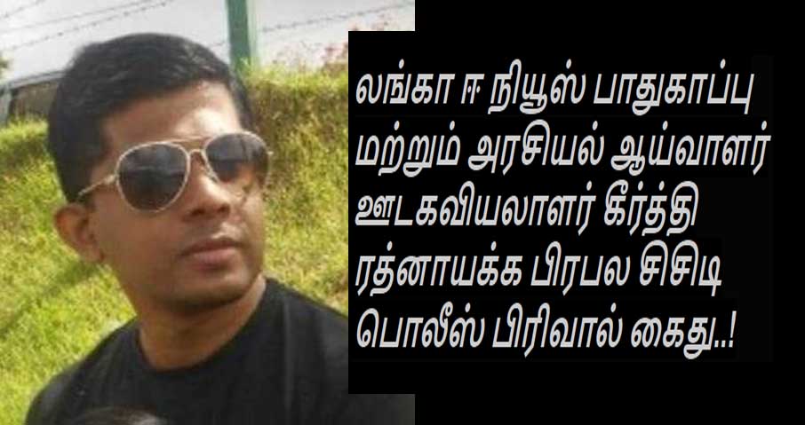 ( லங்கா ஈ நியூஸ் - 2021 , ஆகஸ்ட் 14, பிற்பகல் 1 .40 ) லங்கா ஈ நியூஸ் இணையதளத்தின் பாதுகாப்பு மற்றும் அரசியல் ஆய்வாளருமான ஊடகவியலாளர் கீர்த்தி ரத்நாயக்க சற்று நேரத்திற்கு முன்னர் பிரபல கொழும்பு குற்ற விசாரணை பிரிவினரால் ( சிசிடி ) கைது செய்யப்பட்டுள்ளார். அவர் தங்கியிருந்த இடத்தை சுற்றி வளைத்து கைது செய்த சிசிடி பிரிவினர் தற்போது ஹோமாகம போலீஸ் நிலையத்தில் உள்ளதாக தெரிவிக்கப்படுகிறது. கீர்த்தி ரத்நாயக்க வெளியிட்ட விடயம் ஒன்றில் காணப்படும் உண்மை பொய் தன்மைகளை கண்டறியவே அவர் கைது செய்யப்பட்டுள்ளதாக கைது செய்த அதிகாரிகள் தெரிவித்துள்ளனர்.