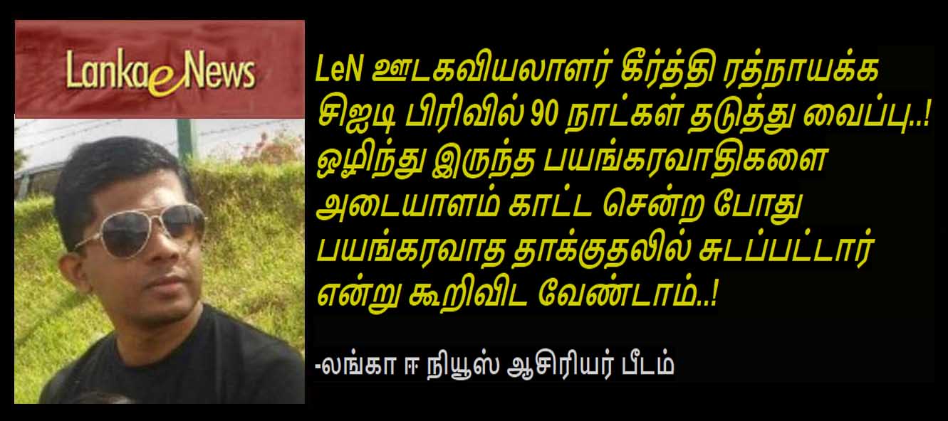 (லங்கா ஈ நியூஸ் - 2021, ஆகஸ்ட், 20, பிற்பகல். 10.30) லங்கா ஈ நியூஸ் பாதுகாப்பு மற்றும் அரசியல் ஆய்வாளர், ஊடகவியலாளர் கீரத்தி ரத்நாயக்க தனிப்பட்ட நட்பின் மூலம் கொழும்பில் உள்ள இந்திய உயர்ஸ்தானிகராலயத்திற்கு தொலைபேசி அழைப்பு எடுத்து தாக்குதல் திட்டம் இருப்பதாக எச்சரிக்கை தகவல் வழங்கிய விடயத்தை கையில் எடுத்துக் கொண்டு ராஜபக்ஷ குடும்ப அரசாங்கம் அவரை கைது செய்து தற்போது கொழும்பு குற்ற விசாரணை திணைக்களத்தில் ( சிஐடி ) பயங்கரவாத தடுப்பு சட்டத்தின் கீழ் 90 நாட்கள் தடுத்து வைத்து விசாரணை செய்து வருகிறது.