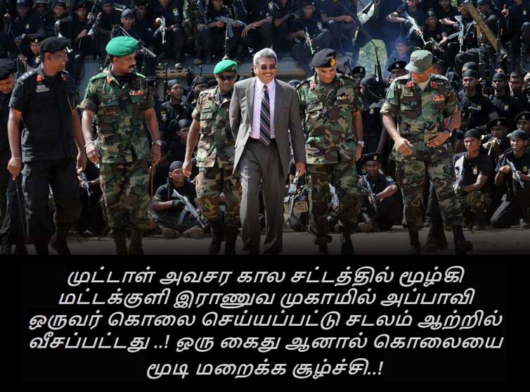 ( லங்கா ஈ நியூஸ் - 2021 , செப்டெம்பர், 13 , முற்பகல் 07.40 ) ஜனாதிபதி கோட்டாபய ராஜபக்ஷ அவசர கால சட்டத்தை அமுல்படுத்தி பொலிஸ் அதிகாரங்களை இராணுவத்திற்கு வழங்கி உள்ளதன் பின்னணியில் அரசாங்க ஆட்சியை புரிந்து வரும் இராணுவம் அப்பாவி பொது மகன் ஒருவரை கடத்திச் சென்று கொலை செய்து சம்பவத்தை வௌிவராது தடுப்பதற்கு சட்டத்தை இரும்பு பாதணிகள் கொண்ட கால்களால் நசுக்கி பயங்கர விடயத்தில் ஈடுபட்டுள்ளமை தொடர்பான செய்தி ஒன்று லங்கா ஈ நியூஸ் உள்ளக தகவல் சேவைக்கு வந்துள்ளது. சம்பவம் வௌி வந்து மூன்று நாட்கள் கடந்தும் எந்த ஒரு ஊடகத்திலும் அதனை பகிரங்கப்படுத்த விடாது மறைத்து வைத்துள்ளமை விசேட அம்சமாகும்.