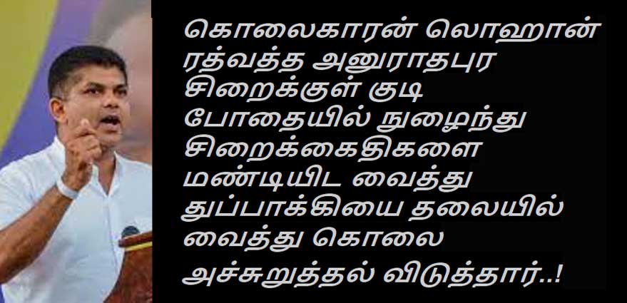 ( லங்கா ஈ நியூஸ் - 2021, செப்டம்பர், 15 முற்பகல் 05.05 ) கடந்த 12 ஆம் திகதி ஜெனிவாவில் ஐக்கிய நாடுகள் மனித உரிமை கூட்டத்தொடர் ஆரம்பமான நிலையில் இலங்கையின் சிறைச்சாலைகள் முகாமைத்துவம் மற்றும் சிறைக்கைதிகள் புனர்வாழ்வு தொடர்பான இராஜாங்க அமைச்சர் கொலைகார லொஹான் ரத்வத்த குடிபோதையில் அனுராதபுரம் சிறைச்சாலைக்கு சென்று அங்குள்ள கைதிகளை அழைத்து மண்டியிட வைத்து தனது தனிப்பட்ட துப்பாக்கியை அவர்களது தலையில் வைத்து கொலை அச்சுறுத்தல் விடுத்துள்ளார்.