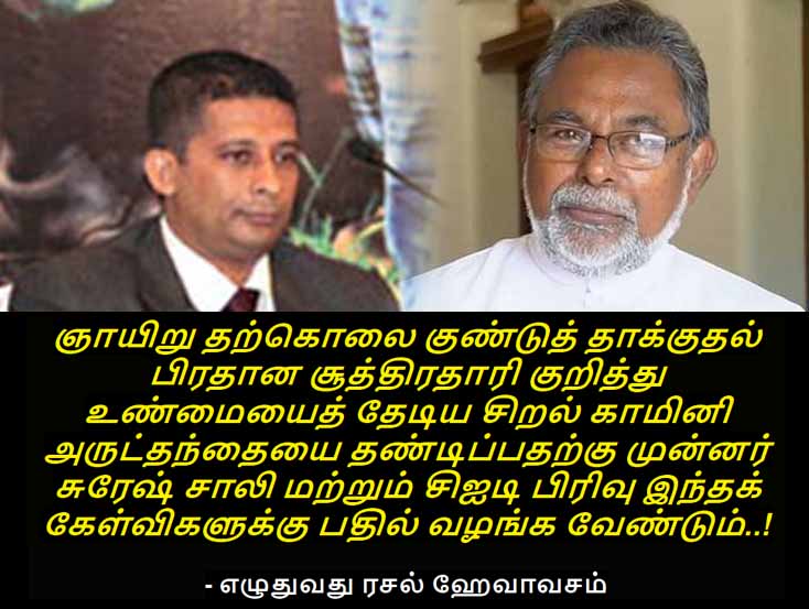 அப்பாவி மக்களை பலி கொண்ட ஞாயிறு தற்கொலைக் குண்டுத் தாக்குதல்கள் தொடர்பான சூத்திரதாரிகள் குறித்து வெளியாகியுள்ள தகவல்கள் மற்றும் பதிவாகியுள்ள சாட்சிகளின் அடிப்படையில் பாதிக்கப்பட்டவர்களுக்கு ஆதரவாக எழுப்பப்படும் குரலை நசுக்குவதற்கு அல்லது ஒடுக்குவதற்கு எடுக்கப்படும் மிக மோசமான கேடு கெட்ட அச்சமூட்டும் முயற்சிகளை கண்டிக்கும் நாம், அரச புலனாய்வுப் பிரிவு பிரதானி சுரேஷ் சாலியின் முறைப்பாடு குறித்து சிஐடி பிரிவினர் விசாரணை செய்வதற்கு முன்னர் சிஐடி பிரிவினரிடம் கீழ் காணும் மிக முக்கியமான கேள்விகள் சிலவற்றை முன் வைக்கிறோம். மத குருவிடம் விசாரணை செய்வதற்கு முன்னர் முடிந்தால் இந்த கேள்விகளுக்கான பதில்களை சிஐடி பிரிவினர் நாட்டு மக்களுக்கு வெளிப்படுத்த வேண்டும் என நாம் சவால் விடுக்கிறோம்.
