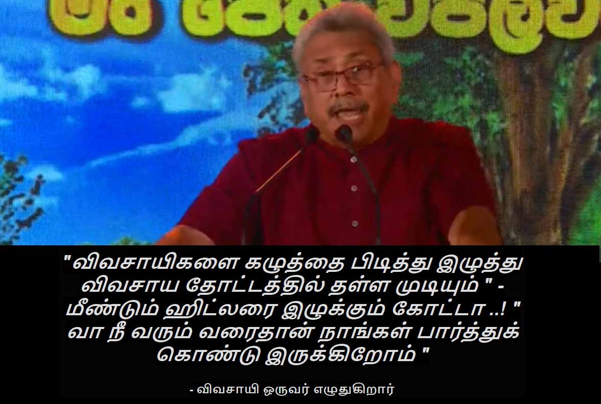 வௌ்ளைப் பூண்டு, சீனி, அரிசி, தேங்காய் எண்ணெய், நெனோ யூரியா, சேதன பசளை, கொரோனா தடுப்பு ஊசி, தனிமைப்ப்படுத்தல் நடவடிக்கை, யுகதனவிய ஒப்பந்தம் உள்ளிட்ட பலவற்றில் ஊழல் மோசடி செய்து கோடிக் கணக்கில் நட்டம் ஏற்படுத்திய பிழைக்கும் ஒருவரை ஏனும் இன்று வரை கழுத்தை பிடித்து தட்டிக் கேட்க திராணி, முதுகெலும்பு இல்லாத இலங்கை நாட்டின் ஹிட்லர் கோட்டாபய ராஜபக்ஷ தற்போது இராணுவத்தினரிடம் கூறி கழுத்தை பிடித்து இழுத்து விவசாய தோட்டத்தில் தள்ள முடியும் என்று கூறுவது அப்பாவி விவசாய மக்களை ஆகும்.