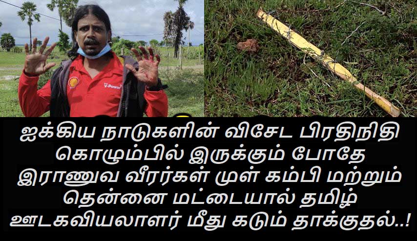 சுதந்திர ஊடகவியலாளர் விஸ்வலிங்கம் விஸ்வசந்திரன் மீது இராணுவத்தினர் முள் கம்பி மற்றும் தென்னை மட்டை கொண்டு கடும் தாக்குதல் நடத்தியதாக முல்லைத்தீவு ஊடக அமையம் சுட்டிக்காட்டியுள்ளது.
