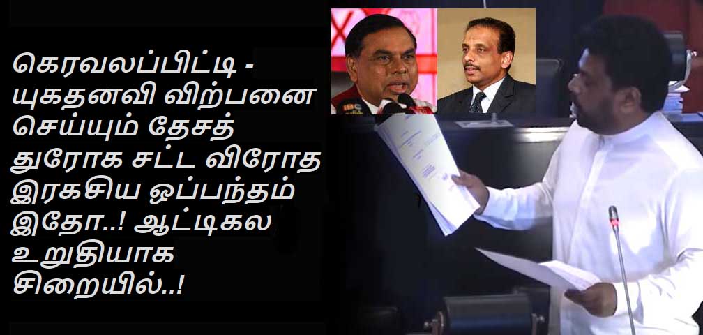 ( லங்கா ஈ நியூஸ் - 2021 , டிசம்பர், 10 , பிற்பகல் 8 15 ) அமைச்சரவையை ஏமாற்றி நாட்டின் நிதி அதிகாரம் கொண்ட பாராளுமன்றத்திற்கு தெரியாமல் ஏமாற்றி நாட்டின் இறைமை அதிகாரம் கொண்ட நாட்டு மக்களையும் முட்டாள்களாக்கி திருட்டுத் தனமாக கையொப்பம் இடப்பட்ட கெரவலபிட்டி - யுகதனவி மின் உற்பத்தி நிலையத்தை ஐக்கிய அமெரிக்க நிறுவனத்திற்கு விற்பனை செய்யும் தேசத் துரோக சட்ட விரோத ஒப்பந்தம் மக்கள் விடுதலை முன்னணியின் தலைவரும் தேசிய மக்கள் சக்தி பாராளுமன்ற உறுப்பினருமாகிய அனுர குமார திசாநாயக்கவினால் இன்று 10 ஆம் திகதி பாராளுமன்றத்தில் சமர்ப்பிக்கப்பட்டது. தகவல் அறியும் சட்டத்தின் ஊடாக குறித்த ஒப்பந்தம் தொடர்பான ஆவணங்களைத் தருமாறு மக்கள் விடுதலை முன்னணி உள்ளிட்ட எதிர்க் கட்சிகள் கோரிக்கை முன்வைத்த போதும் அதற்கு எவ்வித பதிலும் கிடைக்கவில்லை. அதற்கான காரணமும் தற்போது இந்த ஒப்பந்தம் வெளியே வந்துள்ளதால் தெரிய வந்துள்ளது.