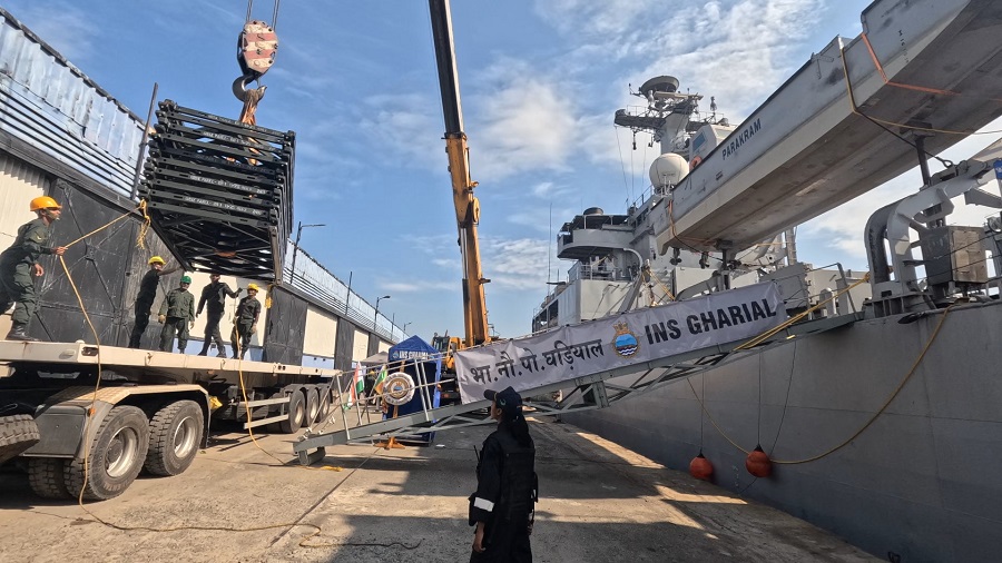 (Lanka-e-News -05.Feb.2026, 11.00 PM) A consignment of 10 Bailey Bridges arrived in Colombo from Visakhapatnam on board INS Gharial. It was formally handed over at a ceremony held on 05 February 2026 by the Acting High Commissioner of India to Sri Lanka, Dr. Satyanjal Pandey, to Deputy Minister of Ports and Civil Aviation, Hon. Hon. Janitha Ruwan Kodithuwakku.