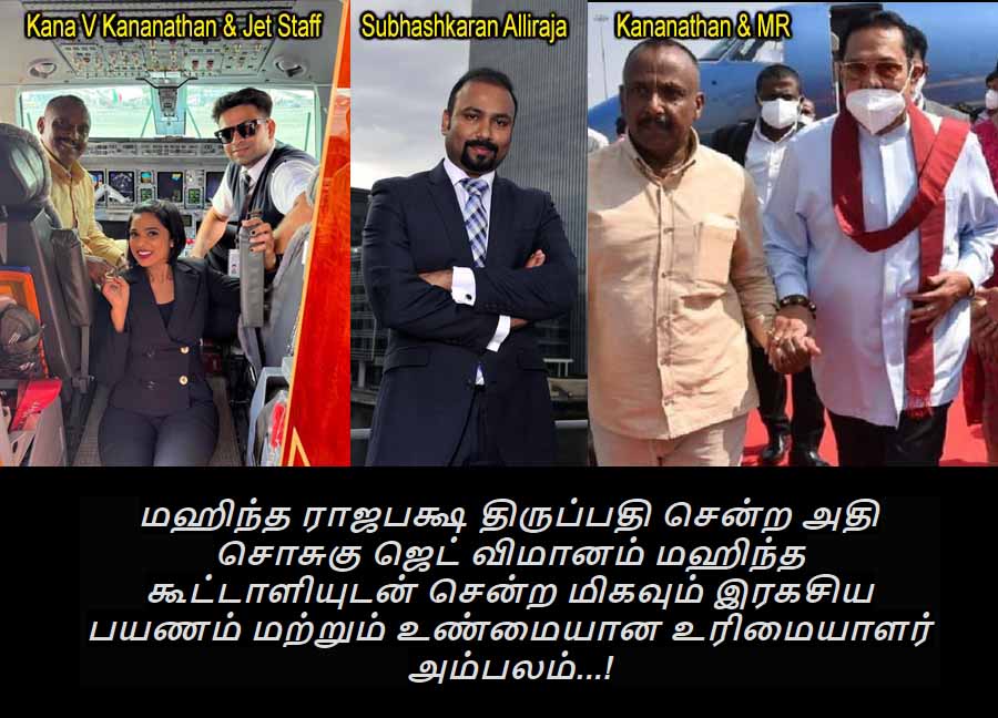 ( லங்கா ஈ நியூஸ் - 2021 , டிசம்பர் , 30, பிற்பகல் 03.00 ) இலங்கை பிரதமர் மகிந்த ராஜபக்ச ( மாரா ) மற்றும் அவரது குடும்பத்தினர் சமீபத்தில் இரண்டு நாள் விஜயமாக இந்தியாவின் திருப்பதிக்கு யாத்திரைக்கு சென்ற T7-JSG தனியார் வர்த்தக அதி சொகுசு ஜெட் விமானம் மற்றும் ராஜபக்சேக்களின் மர்மப் பயணம் பற்றிய மேலதிக விவரங்கள் வௌிந்த வண்ணம் உள்ளன. இந்த விடயமானது சமூக ஊடகங்களில் பெரும் சர்ச்சை ஏற்படுத்தி வருகிறது.