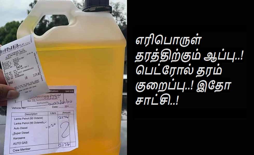 பெற்றோலியக் கூட்டுத்தாபனம் தற்போது விநியோகிக்கும் 95 ஒக்டேன் பெற்றோல் நிறம் மாறியிருப்பதற்கான ஆதாரத்தை இங்குள்ள புகைப்படம் காட்டுகிறது.