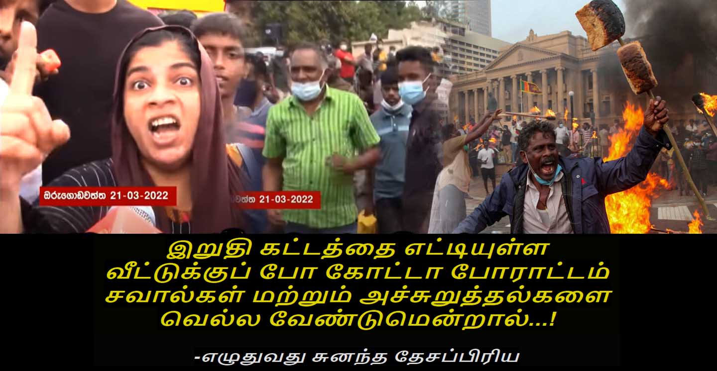 வீட்டுக்குப் போ கோட்டா என்ற கோஷத்தை வெற்றிக் கோஷம் ஆக மாற்றுவதற்கு இன்று அரசியல் கட்சிகள் மற்றும் சிவில் அமைப்புகள் செய்ய வேண்டியது முதலில் அனைவரும் ஒரு தளத்தில் இருந்து பொதுவான ஒன்றை நோக்கி பயணிப்பதாக அதற்கான இணக்கப்பாடு பொதுத் தளத்தில் ஏற்படுத்திக் கொள்ள வேண்டும். நான் இந்த கருத்துக்களை முன் வைப்பதற்கு காரணம் இவ்வாறான எண்ணங்களில் இருக்கும் சக்திகள் அனைவரும் ஒன்றிணைந்து இந்த திட்டத்தை முன்னெடுக்க வேண்டும் என்பதற்காகவாகும். மாறாக வெறுமனே சூத்திரத்திற்காக இந்தக் கருத்துக்களை முன்வைக்கவில்லை.