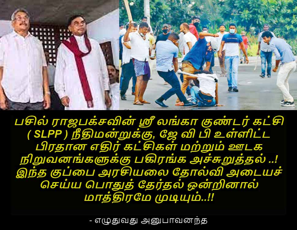 ஜனாதிபதி கோட்டாபய ராஜபக்ச மற்றும் பிரதமர் உள்ளிட்ட அரசாங்கத்தை முழுமையாக பதவி விலகுமாறு வலியுறுத்தி கொழும்பு காலி முகத்திடலில் அமைதியான முறையில் முன்னெடுக்கப்படும் அஹிம்சை போராட்டக்காரர்கள் மீது 9 / 5 அன்று மிகவும் மூர்க்கத்தனமாக காட்டுமிராண்டித் தனமாக நடத்தப்பட்ட தாக்குதலுக்கு ராஜபக்சக்கள் தலைமை தாங்கியதுடன் பசில் உருவாக்கிய குண்டர் அரசியல் வர்க்கம் வழி நடத்தியது. அமைதியான போராட்டத்தால் கட்டவிழ்த்து விடப்பட்ட வன்முறைக்கு எதிராக அவர்கள் அதிகமாகவோ அல்லது குறைவாகவோ எதிர் வன்முறையை எதிர்கொள்ள வேண்டி இருந்தது. ஆனால் மே 17 ஆம் திகதி தொடக்கம் 20 ஆம் திகதி வரை பாராளுமன்ற அமர்வின் போது இந்த குண்டர்கள் சிவில் சமூகம் கொடுத்த செய்தியை புரிந்து கொள்ளத் தவறி விட்டனர் என்பது தெளிவாகியது.