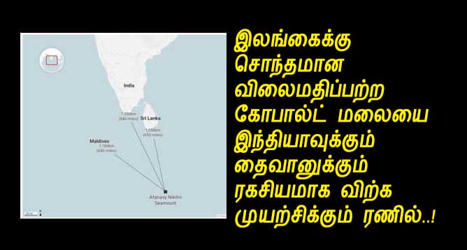 (லங்கா ஈ நியூஸ் -2024.ஜூன்.22, பிற்பகல் 9.30) கோபால்ட் அதிகம் உள்ள 'அஃபனசி நிகிடின் சீமவுண்ட்' 'Afanasy Nikitin Seamount' என்ற இலங்கைக்குச் சொந்தமான கடற்பரப்பு மலையின் ஆய்வு உரிமையை 'விற்கும்சிங்க' என்ற இலங்கையின் இடைக்கால ஜனாதிபதி இந்தியாவுக்கும் தைவானுக்கும் விற்கும் திட்டத்தை செயற்படுத்த புதுடில்லியுடன் ரகசிய உடன்படிக்கைக்கு ரணில் விக்கிரமசிங்க ஒப்புக்கொண்டுள்ளார். இது தேசிய மற்றும் சர்வதேச அரசியல் மற்றும் பொருளாதார வட்டாரங்களில் கலக்கத்தை ஏற்படுத்திய நடவடிக்கையாக மாறி வருகிறது.