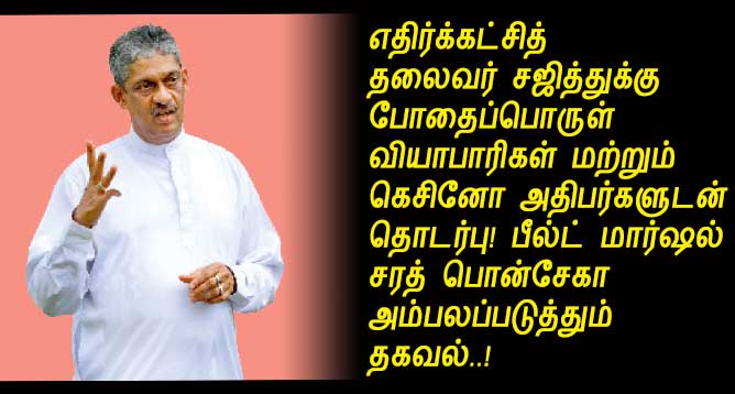 (லங்கா ஈ நியூஸ் -2024.ஜூன்.23, பிற்பகல் 8.45) எதிர்க்கட்சித் தலைவர் சஜித் பிரேமதாசவுக்கு எதிராக நாடாளுமன்றத்தில் பேசிய நாடாளுமன்ற உறுப்பினர் பீல்ட் மார்ஷல் சரத் பொன்சேகா, சஜித்தின் தேர்தல் பிரச்சாரங்கள் மற்றும் சமூக சேவை நடவடிக்கைகளுக்கு போதைப்பொருள் வியாபாரிகள் மற்றும் சூதாட்ட கும்பல்களால் நிதி வழங்கப்படுவதாக அதிர்ச்சி குற்றச்சாட்டை முன்வைத்தார்.