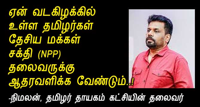 மறுபுறம், அனுரா குமார திசாநாயக்க தமிழ் மக்களுக்கு எப்போதும் ஆதரவாக இருந்து வருகிறார். அவர் எங்கள் துயரங்களையும் பிரச்சனைகளையும் புரிந்துகொள்ளும் ஒரு சகோதரராக பார்க்கப்படுகிறார். அவர் தெற்கின் மக்களுடன் தமிழர்களை இணைக்க ஒரே திறன் கொண்டவர். NPPக்கு வாக்களிப்பதன் மூலம், வடகிழக்கில் உள்ள தமிழர்கள் ஒற்றுமையான இலங்கையை உருவாக்குவதில் பங்களிக்க முடியுமோடு, எங்கள் பிராந்தியத்தில் முன்னேற்றம் மற்றும் வளர்ச்சி மேம்படுவதை உறுதி செய்யலாம்.