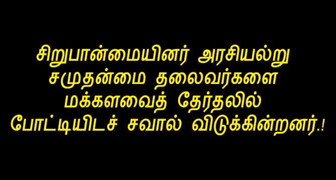 (லங்கா ஈ நியூஸ் - 2024 செப்டம்பர் 16, மு.ப. 11.00) சிறுபான்மையினர் அரசியல்분்று분ா்களான ஒரு குழு, இலங்கை முஸ்லிம் காங்கிரஸ் தலைவரான ரவூப் ஹக்கீம், எம்.ஏ. சுமந்திரன், ராசாமணிக்கம் சணகியன், மற்றும் ரிஷாட் பாதியூதீன்ஆன் ஆகிய முதன்மை தலைவர்களை, வரவிருக்கும் பொதுத் தேர்தலில் நேரடியாகப் போட்டியிட்டு தங்கள் பிரபலத்தைக் காண்பிக்கச் சவால் விடுக்கின்றனர். தேசியப் பட்டியல் மூலம் இருக்கைகளைப் பெறுவதைவிட, சிறுபான்மையினர் சமூகங்களை பிரதிநிதித்துவம் செய்கிறேன் என்று கூறும் இத்தலைவர்கள் நேரடியாகத் தேர்தலில் போட்டியிட்டு உண்மையான மக்களரவை ஆதரவை நிரூபிக்க வேண்டும் என்று அவர்கள் வலியுறுத்துகிறார்கள்.