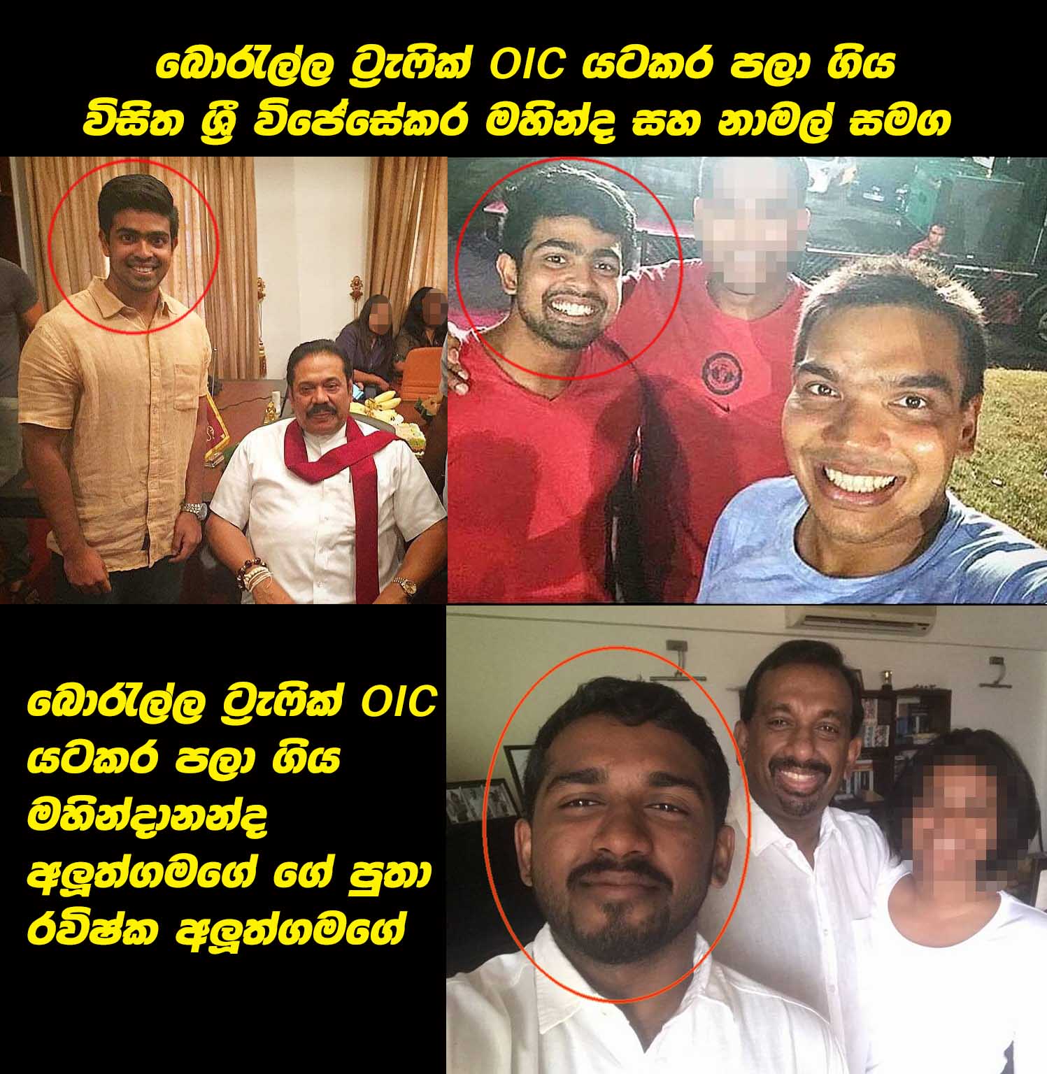 (ලංකා ඊ නිව්ස් -2019.පෙබ.25, ප.ව.12.40) පොලිස් යතුරු පැදියකින් යමින් සිටියදී බම්බලපිටිය මංසන්ධියකදී බොරැල්ල පොලිසියේ රථ වාහන අංශයේ ස්ථානාධිපතිවරයා ඩිෆෙන්ඩර් රියක හප්පා යටකර බරපතල තුවාල සිදුකළ බව දැන දැනම පලා ගොස් ඇත්තේ මහින්දානන්ද අලුත්ගමගේ පුත් රවිශ්ක අලුත්ගම සහ ජනාධිපති ආරක්ෂක අංශයේ පොලිස් අධිකාරීවරයෙකුගේ පුත් විසිත ශ්රී විජේසේකර නමැති අය ඇතුළු පිරිසක් බව හෙළිවී තිබේ.