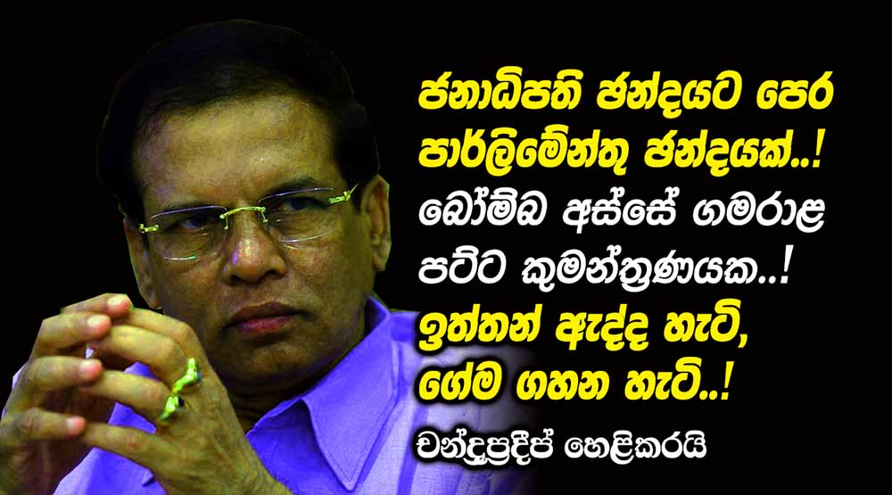 (ලංකා ඊ නිව්ස් -2019.මැයි.28, පෙ.ව.7.25) මාතෘභූමිය බිලිගත් ලෝක ත්රස්තවාදයකින් සහ ඇවිලෙමින් යන ජාතිවාදී ගිනි දැල් වලින් රටවැසියන්ගේ ජීවිත සහ දේපොල විනාශ වෙද්දී වගේ වගක් නොමැතිව තම පුද්ගලික අභිමතාර්ථයන් හීන් සීරුවේ ඉටු කරගන්නා ජනාධිපති පල්ලෙවත්ත ගමරාළලාගේ මෛත්රීපාල යාපා සිරිසේන ජනාධිපතිවරණ ඡන්දය කල් දමා පාර්ලිමේන්තුව විසිරුවා හැරීමේ බලය තමා අතට ගැනීමේ කුමන්ත්රණයක නියැලෙමින් සිටින බව ලංකා ඊ නිව්ස් වෙත වාර්තා වේ.